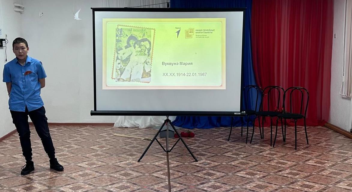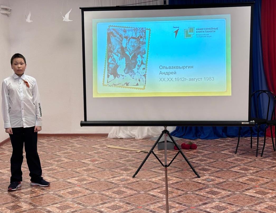 Сегодня в школе прошла акция «Наши семейные книги памяти». На основе изученных материалов участники акции подготовили минутное публичное выступление с рассказом о своих родственниках, тружениках тыла Чукотки. На Чукотке, за тысячи километров от линии действующего фронта, тоже ковалась Победа. Жители округа отдавали в фонд обороны, то немногое что у них было. Победа доказала, что воля и сплоченность всего народа – это огромная сила. Акция «Наши семейные книги памяти» помогает сохранить историю подвига нашего народа.