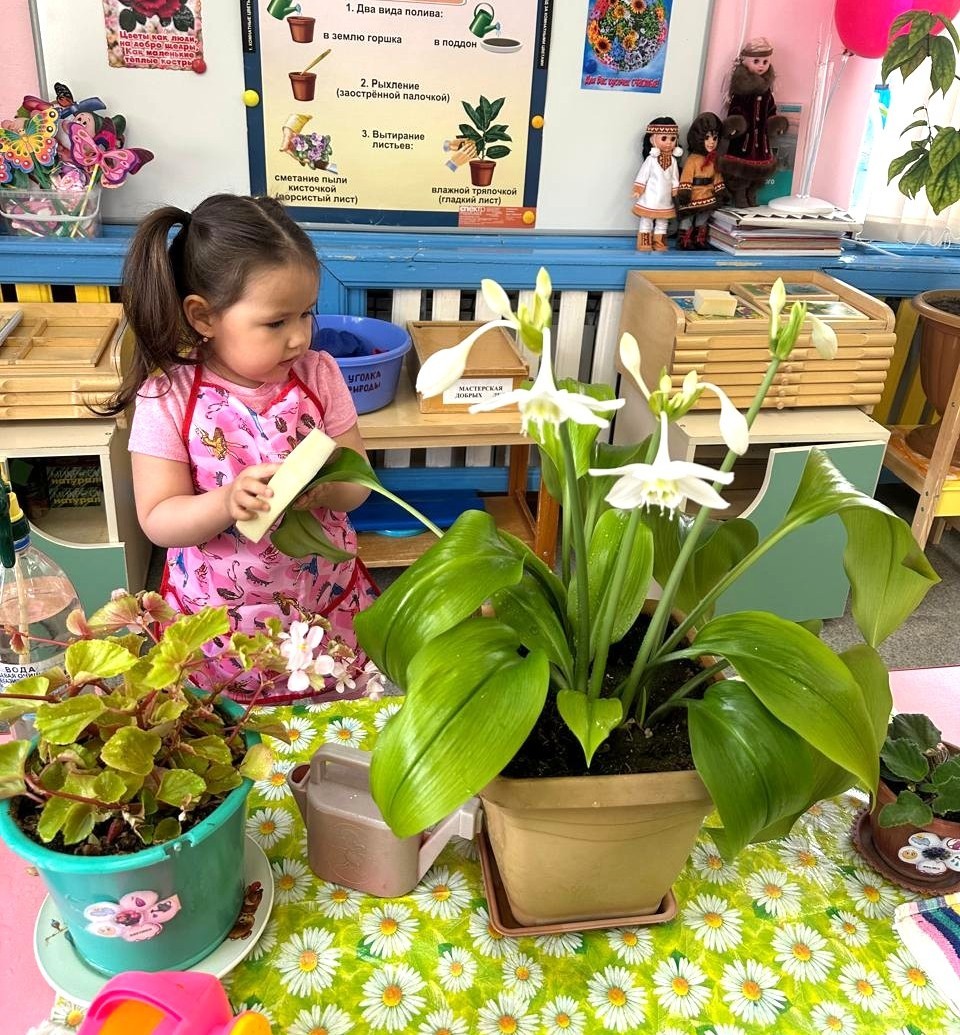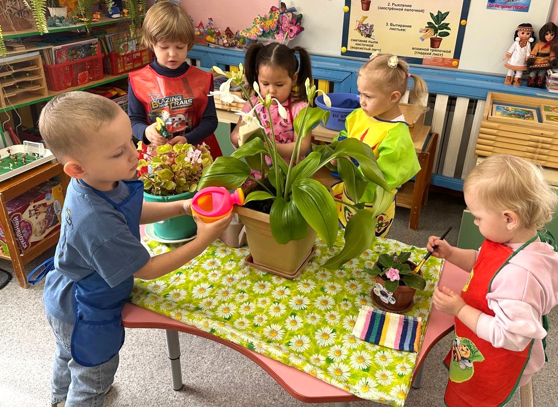 В разновозрастной группе детского сада прошел тематический «День цветов» — это мероприятие, направлено на знакомство детей с миром цветов, их видами, названиями и пользой. Ребёнок проводит в детском саду большую часть дня. Создать живую, домашнюю атмосферу в помещении нам помогают комнатные цветы и растения. Наши ребята любят ухаживать за цветами – поливать, рыхлить, опрыскивать. Такие элементарные трудовые поручения воспитывают интерес к комнатным растениям и желание ухаживать за ними, способствуют формированию у детей экологической культуры и бережного отношения к природе.