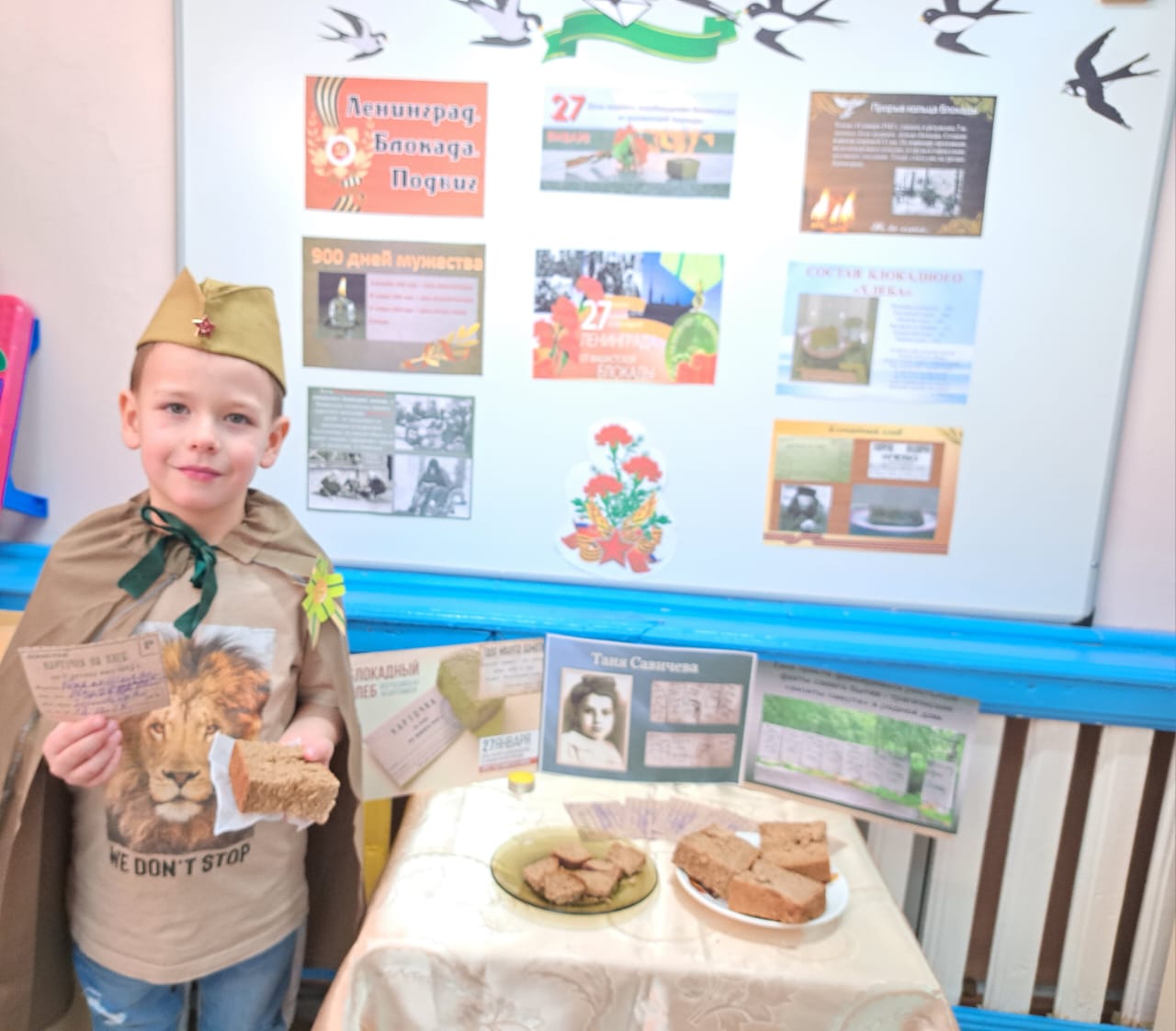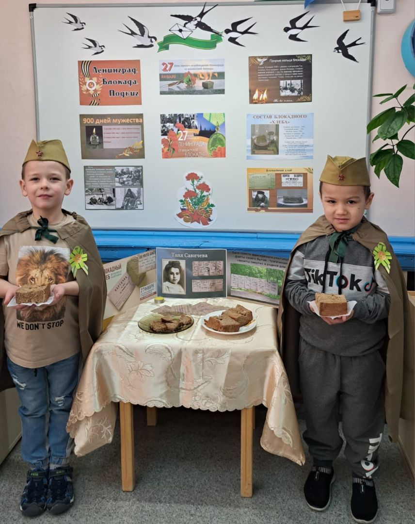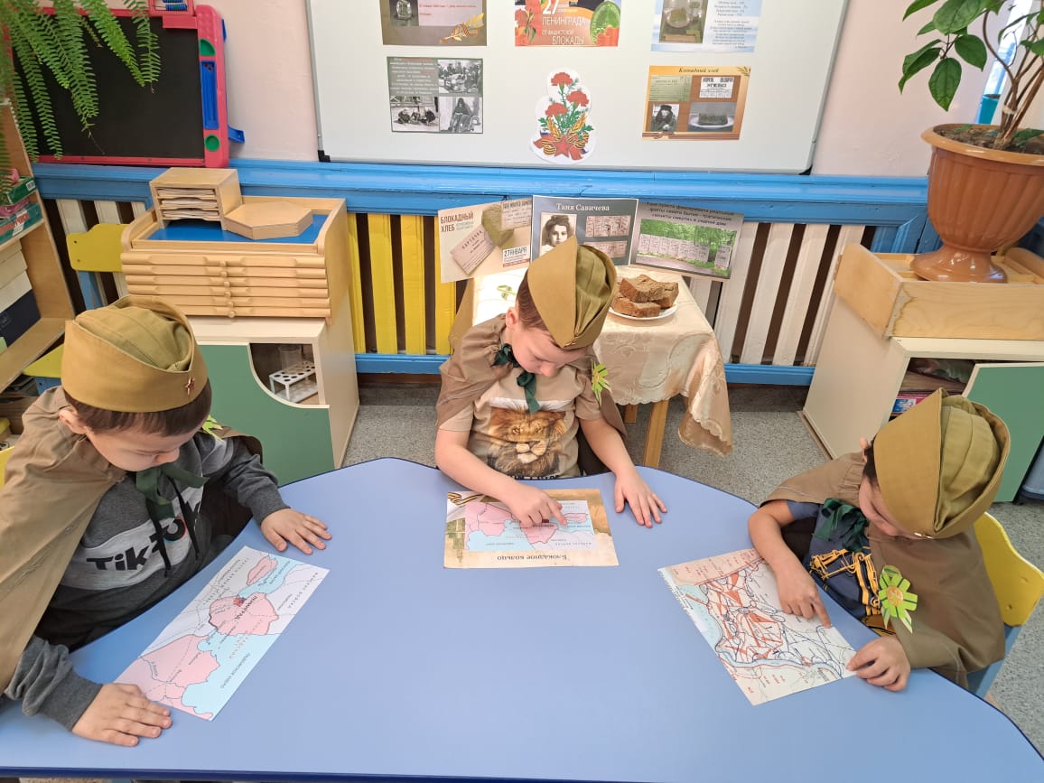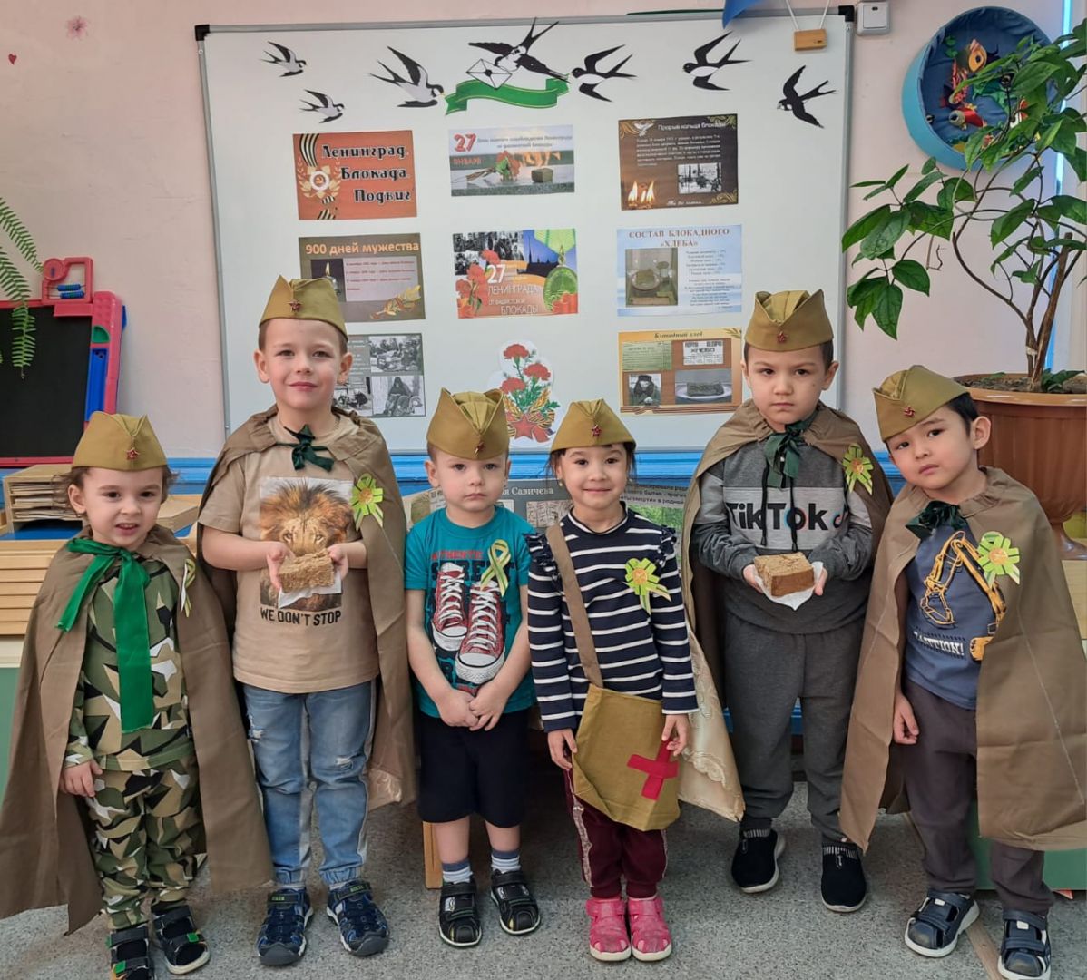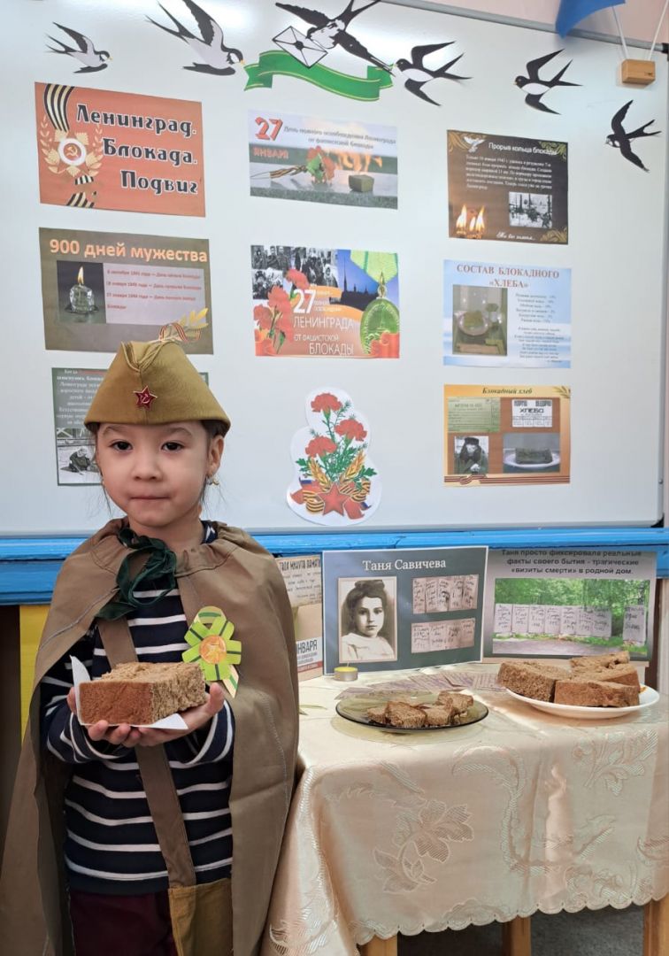 27 января, в день снятия блокады Ленинграда, с воспитанниками старшего дошкольного возраста была проведена беседа о жизни жителей осажденного города. Ребята узнали, что за все время блокады от голода погибло очень много взрослых и особенно детей. Одной из таких девочек была Таня Савичева, она жила в обыкновенной ленинградской семье. Единственным источником жизни был кусочек черного хлеба, который выдавали по карточкам, всего 125 грамм в день. Дети рассмотрели карту и фотографии блокадного Ленинграда, символом которого стала небольшая ленточка оливкового и зеленого цвета – цвета Жизни и Победы. Все увиденное и сказанное произвело на детей впечатление и вызвало волнение. Эта дата должна напоминать миру о том подвиге, который совершили жители блокадного Ленинграда.