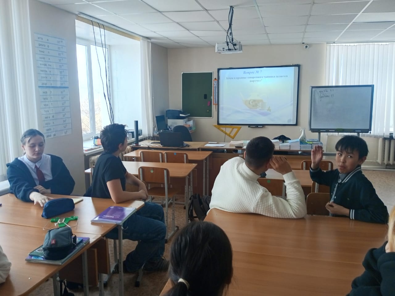 15 апреля в рамках недели предметов естественнонаучного цикла на базе центра образования естественнонаучной и технологической направленностей «Точка роста» была проведена интеллектуальная игра по физике с учащимися 7 класса. В ходе 5 раундов игры наилучший результат продемонстрировала команда «Улыбка». Наиболее активными участниками мероприятия были Рультын Павел, Эттынеут Алекс, Польшикова Дарья и Кондрашкина Александра. Целью данного мероприятия было: повысить интерес обучающихся к физике, как одному из предметов естественно-научного цикла; стимулировать познавательную активность и творчество обучающихся, их смекалку, наблюдательность; научить применять знания в новой ситуации, а также грамотно объяснять происходящие физические явления.