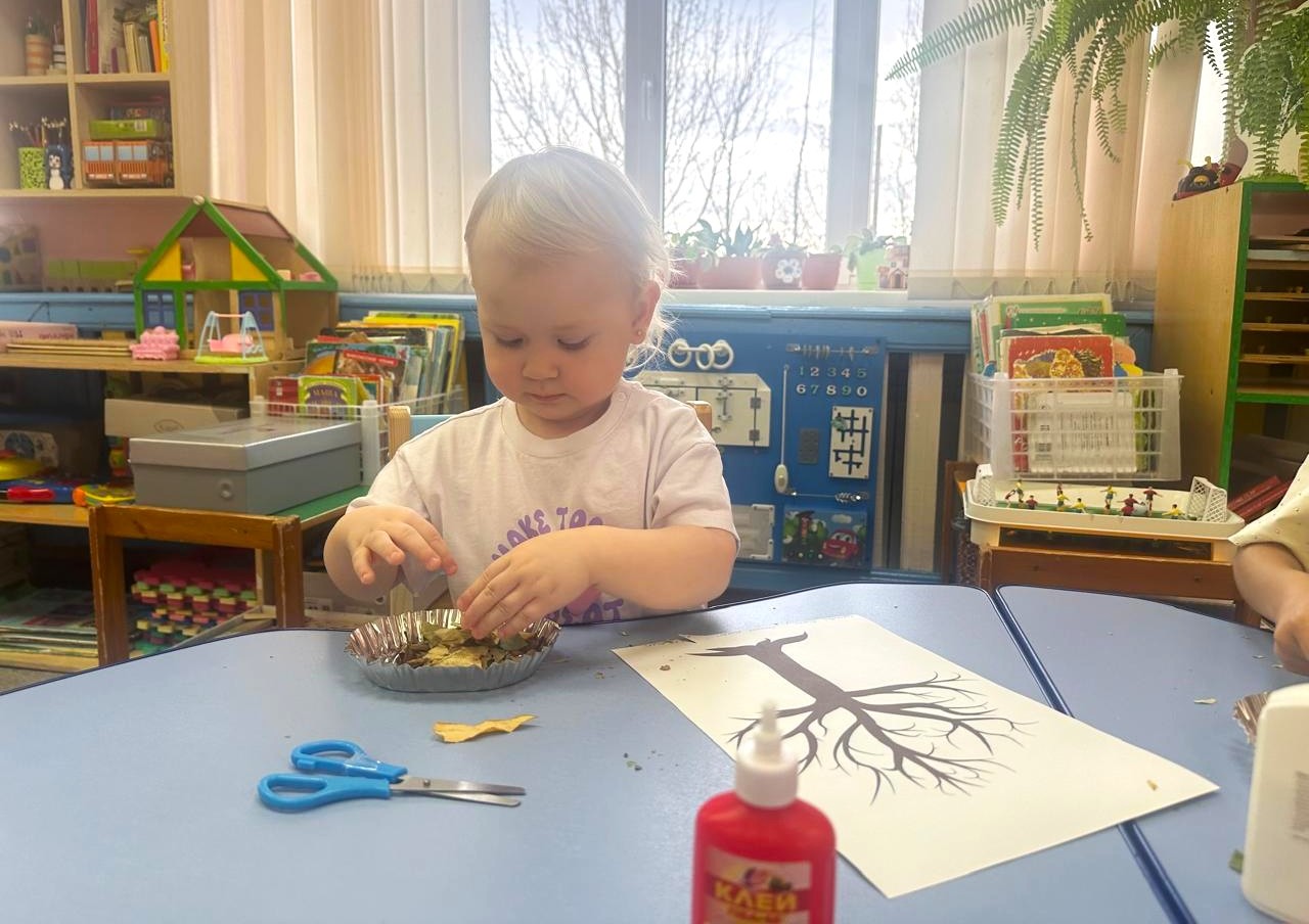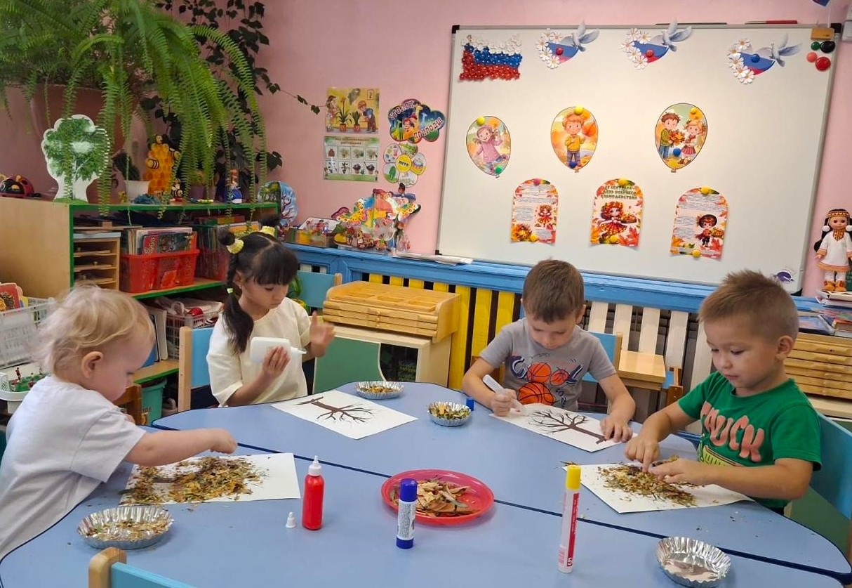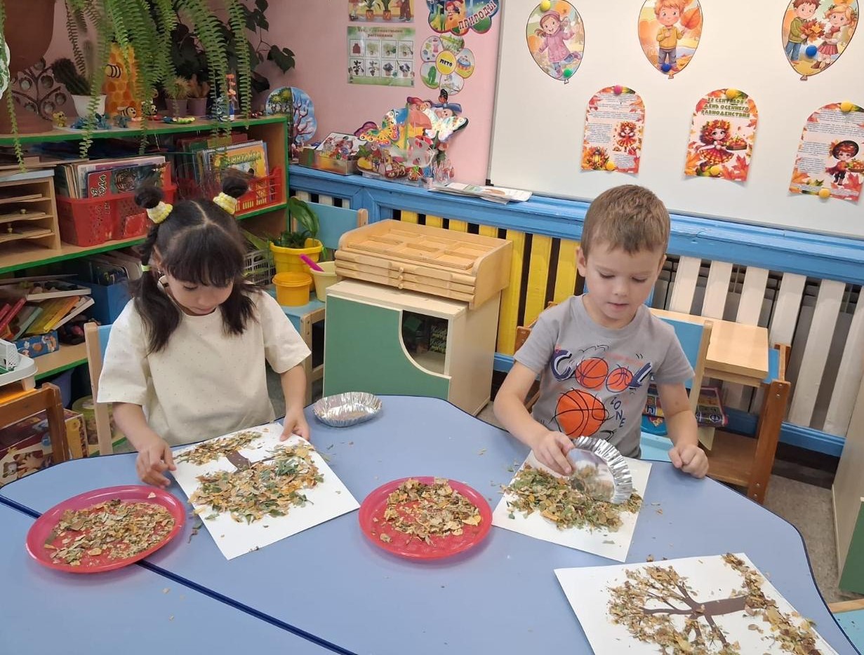 Золотая осень всегда радует нас своими неописуемыми яркими разноцветными красками. Окружающая природа осени вызывает желание создавать красоту своими руками. Дети разновозрастной группы детского сада собрали красивые осенние листья на участке и выполнили аппликацию. Ребята учились создавать образ листьев деревьев в технике обрывания, развивали умение гармонично подбирать цвета. В результате получились удивительные, необычные деревья, которые украсили выставку группы. Вчера мы собирали листву на участке, а сегодня мы выполняли композицию «Осенний лес». Всегда высшей наградой является то, как дети увлечены и получают от этого радость и удовольствие.