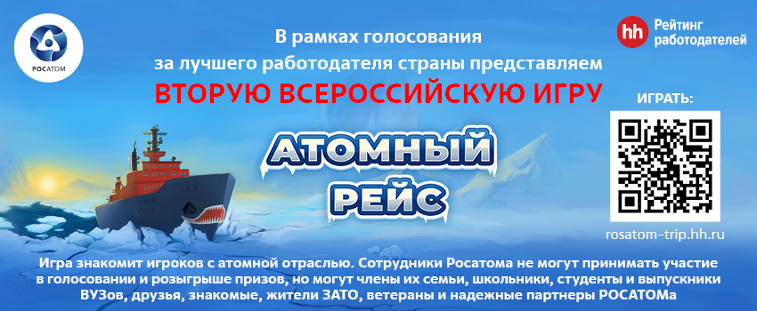 В рамках участия в рейтинге лучших работодателей России Росатом запустил вторую всероссийскую браузерную игру «Атомный рейс» для знакомства соискателей с работой в атомной в отрасли. В этот раз игроку предоставляется возможность почувствовать себя частью команды Росатома и спасти судно, перевозящее мишек в среду их обитания, которое застряло во льдах. От каждого решения игрока зависит успешность миссии. Для самых внимательных участников будет предоставлена возможность попробовать себя в усложненном уровне и получить возможность прямого трудоустройства в Росатом. Каждый, кто до 31 октября зарегистрируется на сайте игры, получает возможность принять участие в розыгрыше эксклюзивных призов от Росатома, приуроченных к году науки и технологий в России. В «Атомном рейсе» каждый сможет испытать свои силы и почувствовать себя членом дружной команды Росатома и настоящим покорителем Арктики. Игра создана при участии экспертной команды Дирекции северного морского пути Госкорпорации «Росатом».