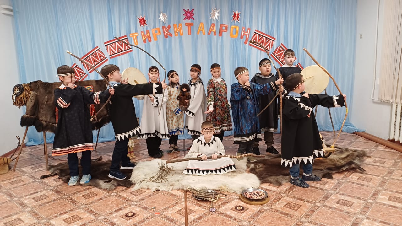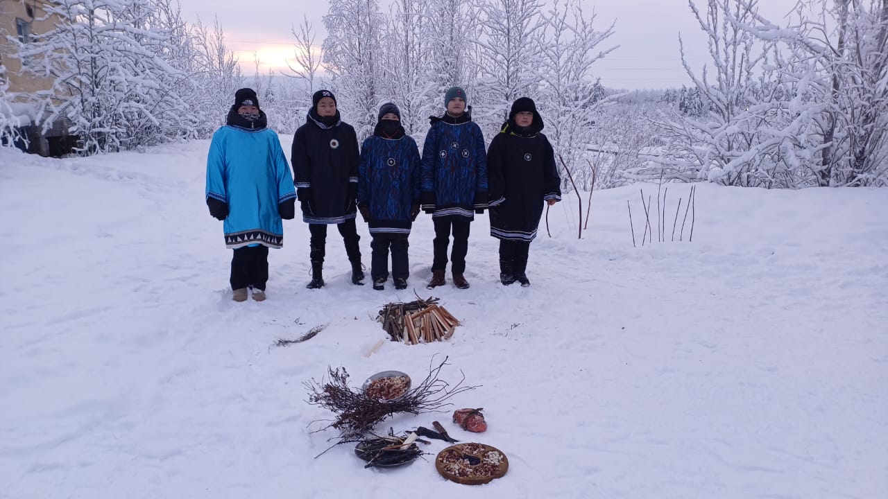 Национальный чукотский праздник «Встреча Солнца» стал традиционным для обучающихся школы — интернат. 21.01.2025 обучающиеся школы в красивых камлейках выпустили стрелы в сторону солнца. Приготовили самые лучшие угощения, разложив на деревянном блюде, забили жертвенного, символичного оленя, разожгли костер для обряда Благодарения всех сил природы. Каждый мог подойти к жертвенному костру вдохнуть запах дыма от багульника, поблагодарить силы природы – солнце, огонь, воду, воздух, ветер. Папановой Т.А. была организована фотозона для обучающихся МБОУ «Школа-интернат с. Кепервеем» и для воспитанников детского сада. Все желающие могли сделать колоритные фотографии с национальными элементами быта и одежды народов севера.